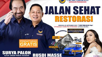 Diketahui, Jalan Sehat Restorasi NasDem Sulsel ini akan dihadiri Ketua Umum Partai NasDem, Surya Paloh. Sejumlah hadiah menarik juga telah disiapkan.