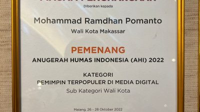 MALANG, Newstime.id — Wali Kota Makassar, Moh. Ramdhan ‘Danny’ Pomanto dianugerahi penghargaan Pemimpin Terpopuler 2022 di Media Digital 2022 sub kategori Wali Kota dalam Anugerah Humas Indonesia 2022 di Hotel Atria Malang, Jawa Timur, Jumat (28/10/2022) lalu.