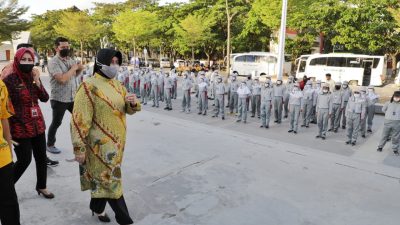 Ketua Tim Penggerak PKK Kota Makassar, Indira Yusuf Ismail, didampingi Asisten 1 Drs Andi Muhammad Yasir, memberikan motivasi kepada Paskibraka agar tetap menjaga stamina dan imunitas.