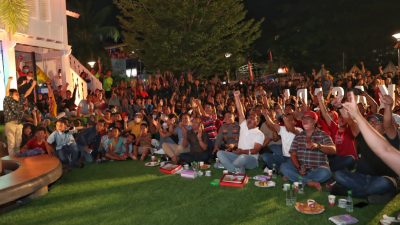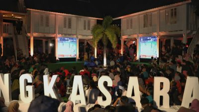 Pengunjung Makassar F8 bersama dengan Wali Kota Makassar Moh Ramdhan Pomanto nonton bareng di area zona tiga Rumah Adat Makassar Anjungan Pantai Losari, Sabtu (10/09).