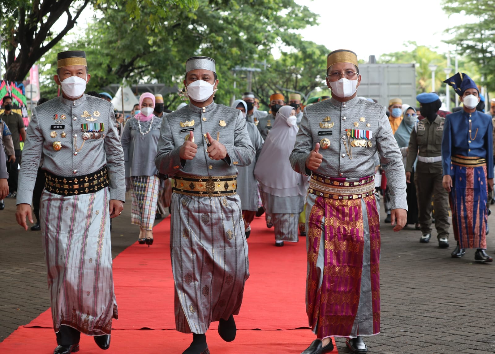 Rombongan Wali Kota bersama Plt Gubernur dan Forkopimda baik Sulsel maupun Makassar sebelumnya tiba di Baruga Anging Mammiri Rumah Jabatan Wali Kota Makassar lalu selanjutnya berjalan kaki menuju anjungan tempat pelaksanaan HUT Makassar 414 tahun.