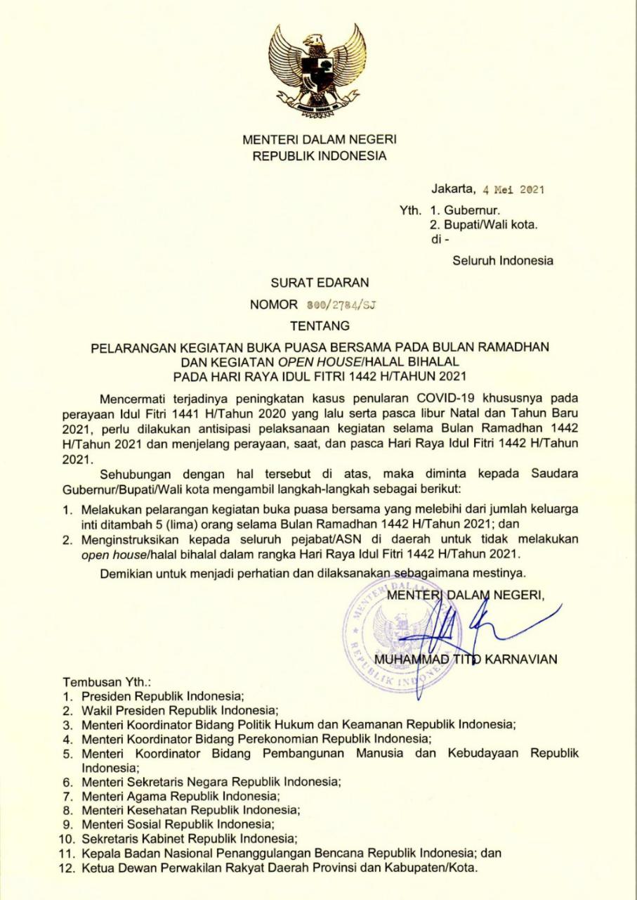 “Melakukan pelarangan kegiatan buka puasa bersama yang melebihi dari jumlah keluarga inti ditambah 5 (lima) orang selama Bulan Ramadhan 1442 H/Tahun 2021,” jelas Tito.