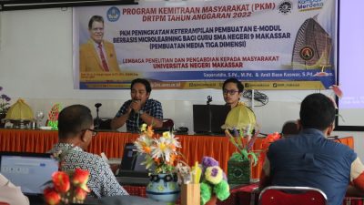 MAKASSAR,Newstime.id – Dosen sebagai tenaga pendidik di tingkat perguruan tinggi memiliki kewajiban Tri Dharma Perguruan Tinggi, yaitu kewajiban untuk melaksanakan pengajaran, penelitian dan pengabdian kepada masyarakat. Oleh karena itu tim PKM Universitas Negeri Makassar, Saparuddin, S.Pd., M.Pd. (Dosen Prodi Pendidikan Biologi) dan Andi Baso Kaswar, S.Pd., M.Kom (Dosen Prodi Teknik Komputer) melaksanakan kegiatan Pengabdian kepada Masyarakat berupa pelatihan pembuatan E-modul berbasis microlearning bagi guru SMA Negeri 9 Makassar. Pelatihan tersebut diadakan setelah melakukan identifikasi dan analisis terhadap kebutuhan guru SMA Negeri 9 Makassar dalam rangka meningkatkan kualitas proses pembelajaran.