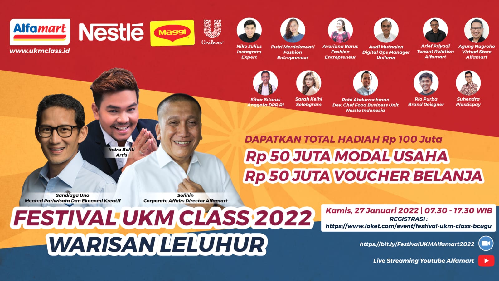Nah, Alfamart bersama Nestle akan mengadakan Festival UKM Class Alfamart 2022 “Warisan Leluhur”. Talkshow dan webinar gratis yang akan membahas strategi dari A sampai Z serta mengupas bagaimana memulai usaha, apa yang bisa, dan apa yang harus kita lakukan agar usaha mandiri kita semakin maju. Festival UKM Class Alfamart 2022 diadakan pada Kamis, 27 Januari 2022 esok pukul 07.30 sampai 17.30 WIB.