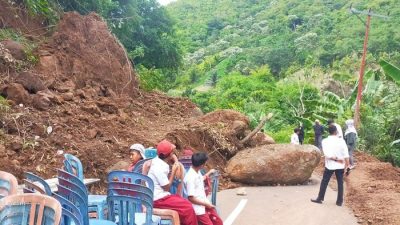 Aryananda menambahkan, tim dari Dinas Bina Marga Cipta Karya dan Tata Ruang (BMCKTR) sudah di lokasi untuk melakukan survei. Namun tim belum bisa berbuat banyak memindahkan material longsor berupa batu besar.