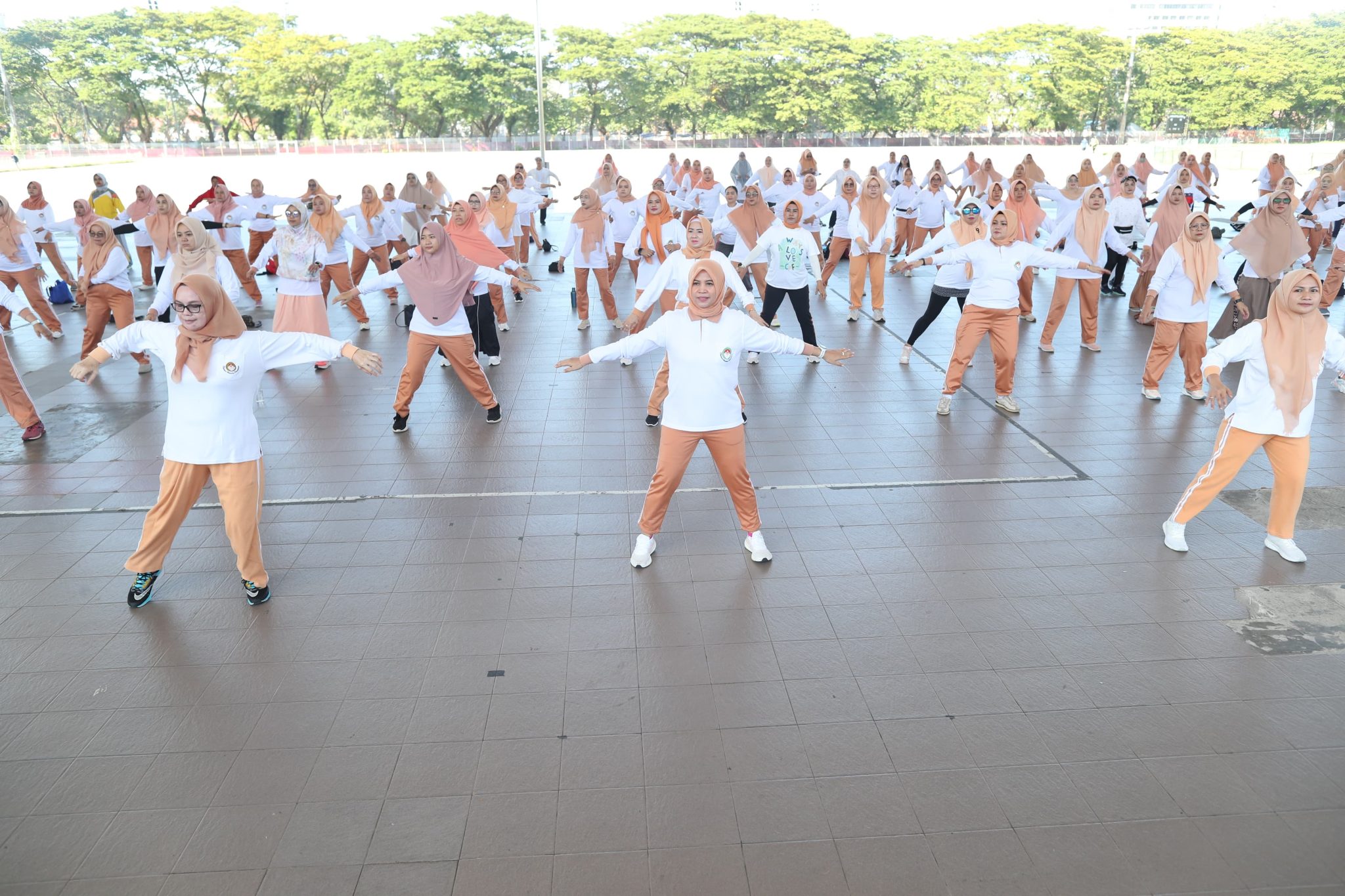 Sebanyak 300 anggota DWP Kota Makassar hadir dalam seragam olahraga putih orange, dengan kompak mereka senam bersama dengan energik di lapangan.