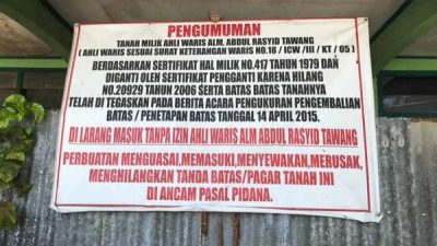 “Dilarang masuk tanpa izin ahli waris almarhum Abdul Rasyid Tawang. Perbuatan menguasai, memasuki, menyewakan, merusak, menghilangkan tanda batas/pagar tanah ini diancam pasal pidana,” demikian tertulis dalam spanduk tersebut.