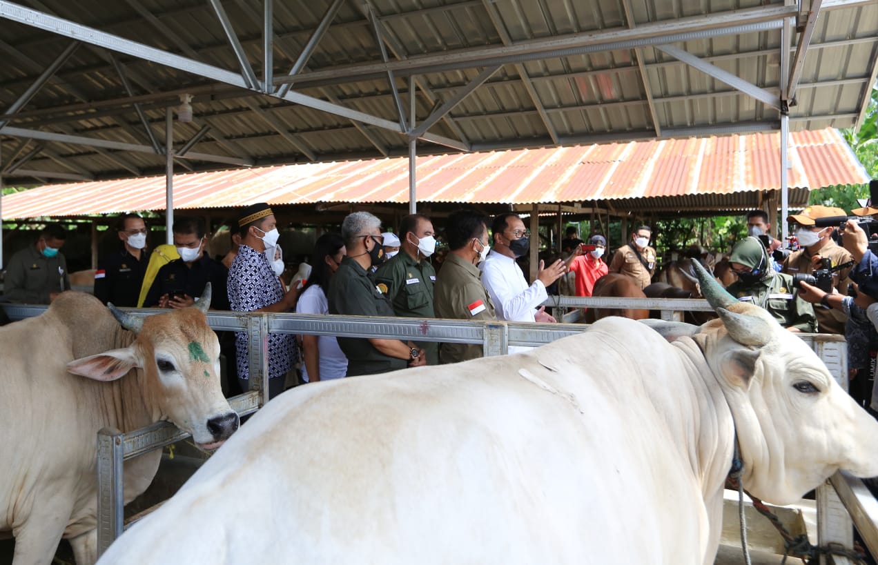 Di dampingi oleh Wali Kota Makassar Moh Ramdhan “Danny” Pomanto, Mentan Syahrul nampak teliti dalam memperhatikan kondisi beberapa hewan qurban.